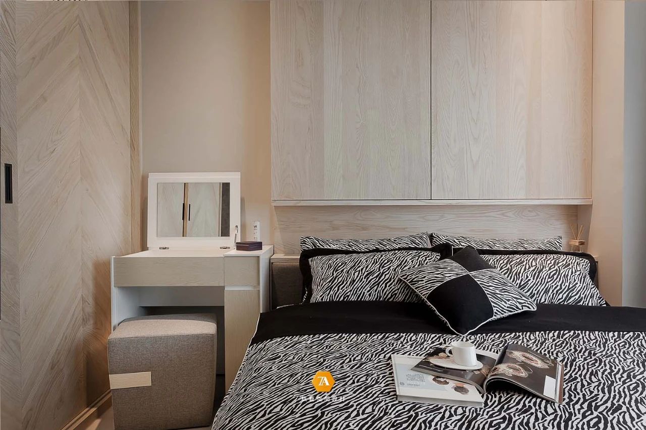▲主臥空間同樣以簡約的手法設計,但相較於客餐廳的冷清色調,其所營造的則是溫暖舒心的氛圍。溫潤的木飾面透過在床頭背景墻已經衣櫃門板上的運用,使得整個空間都散發出一種宜人的溫度,同時簡約的裝飾,也能讓人在空間之中放松平靜。