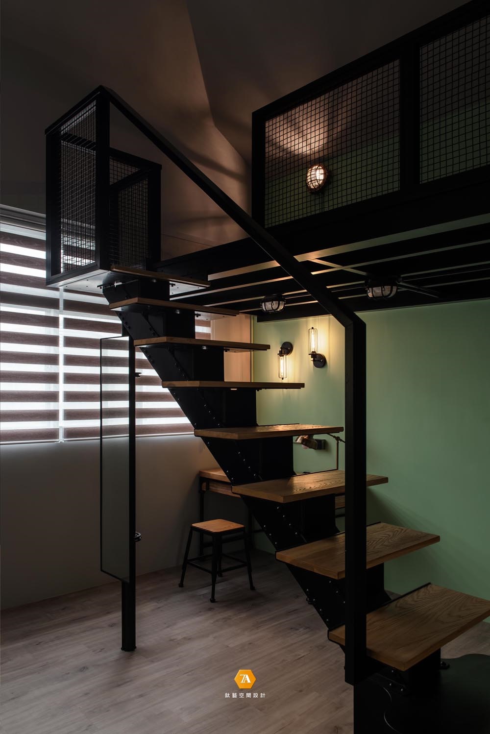 主臥在色調上,主要以淺色為主,少許的黑色與鐵件質材為空間營造時尚格調。主臥床頭以線條和色塊透由一個面向另一個面延伸擴展,讓空間在視覺上產生層次感。而次臥則在材質使用上與工作室有著相同之處,同樣以鮮明的綠色加上鐵藝樓梯,將個性感十足的空間,完美的營造了出來,讓主體空間趨向和諧統一。