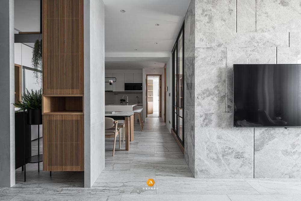 置身白凈色域的客廳,運用簡潔而方正的線條架構空間,並鋪設灰質磁磚地板呼應大理石電視墻、灰漆飾帶,以及灰藍相間的齊頂壁櫃,打點出溫和的中性色調。而開放幅度幾近滿墻的大片窗扇,則適度地為場域剪裁日光,並在紗簾和清透無觸下,使之均勻地鋪撒入室,映照軟件由內向灰白漸變為外向的藍綠色彩,恰好迎合窗扇鋪墊的日光暖座,並與栽種露臺的綠意光景融出一片自然氛圍。