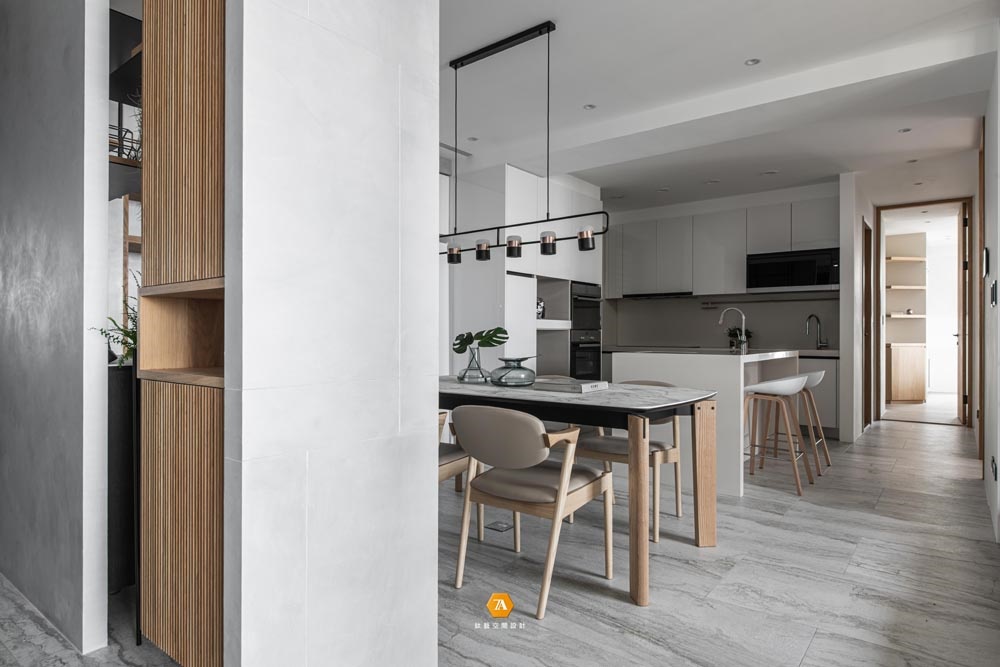 繞過電視墻,率先躍入眼簾的是潔白的場景印象,由暖棕木質、深黑鐵件與清淺石材為主要元素所構成的場景,以清晰的動線規劃開啟新局——餐區與廊道分居兩側,餐食區快內部再分出聚會餐桌、多功能中島與料理烹調的煙火區塊。而中央廊道串起來的機能場景不僅於此,使用者只要稍轉個身,另一片靜謐的書房場景便於焉展開,自在裁劃出的日常軌跡,更讓一家四口的情感隨心,往來井井。