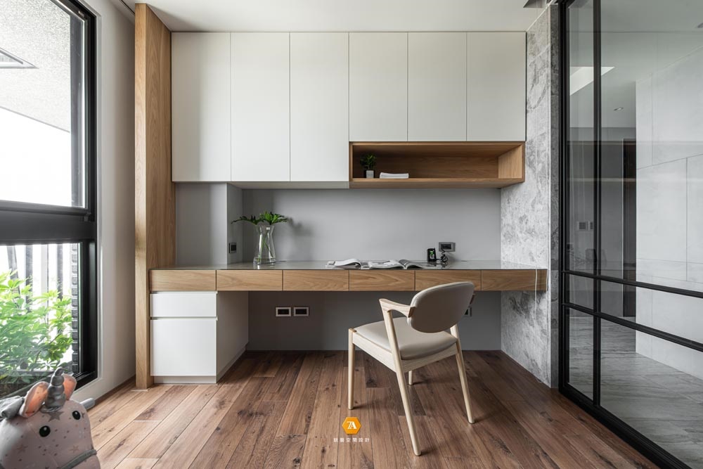 開啟書房,設計者簡單放入的光、木頭與靜謐氣息了然眼前;因應落地款式的窗,應和清波門片的鐵件巧思,回歸樸質可愛的幾何分割,並在趣味效果之外、將大自然的明媚與嫩綠一路傳遞至室內側餐廚區,順耳帶動滿室簡約的線條與色彩。屹立左右的收納櫃體則由沈穩的木質擔當,或開放或封閉地使展品及藏書各安其所,圍塑一方天光盈照的穩密天地,同時成為包容親子互動的寬敞園地。