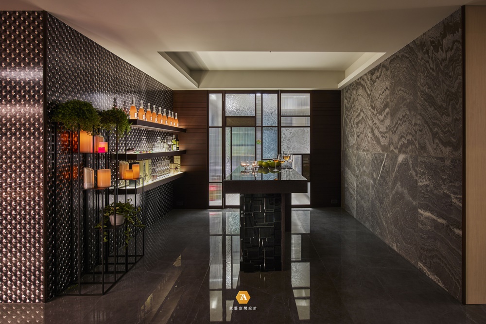 客廳一隅,金屬壁紙映襯著精品酒架,在底部精心安排的燈光,透過架子上酒瓶、玻璃杯的投射,讓空間中感受到濃濃的酒吧景象;同時,仿蠟燭的燈體閃爍稀微光芒,為環境點上高雅的情調。中間矗立的吧臺采用蒙德裏安的幾何元素,使用立體分割,與拉門上的幾何圖案相呼應,在黑亮的臺體上展現時尚前衛的設計風格。山水石壁的沈穩之下,為家庭打造閑適優雅的飲酌角落。