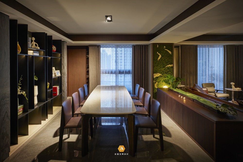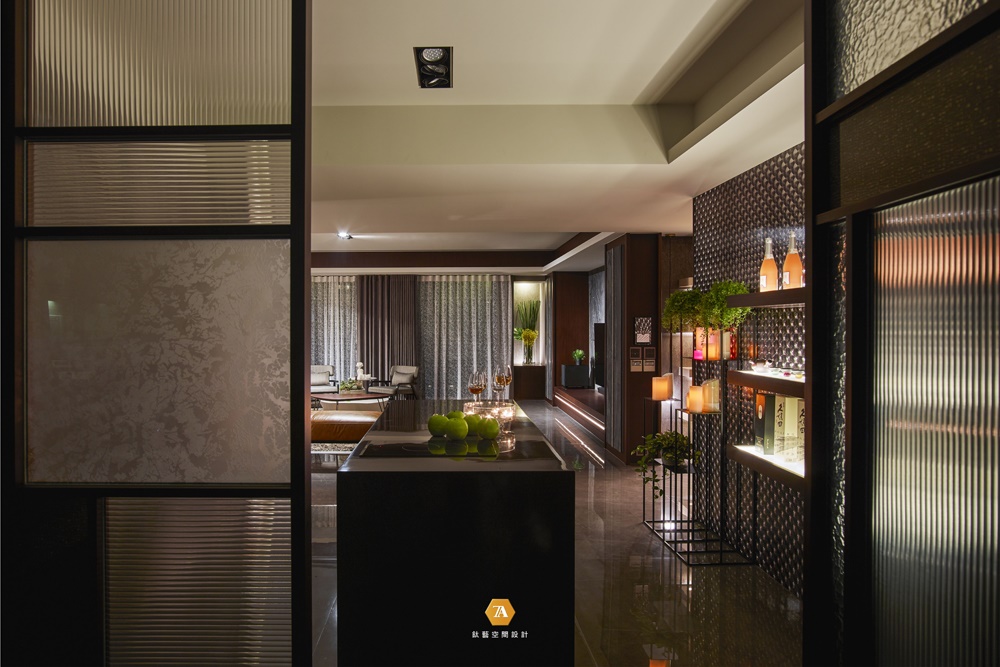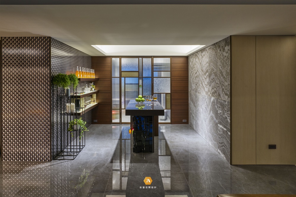開放式玄關拉伸室內景深,廊道墻內嵌入照明燈的弧形設計,形塑空間的層次變化。而端景處特別定製鐵件藝術品,在藍光與白光照射中映出精致時尚格調;透過大理石地面倒影延展,在虛與實間交錯成有趣的對話。同時,水滴型鑲金色邊的鏡子點綴深色木面,與鐵件共築奢華又不失沈穩的風格。