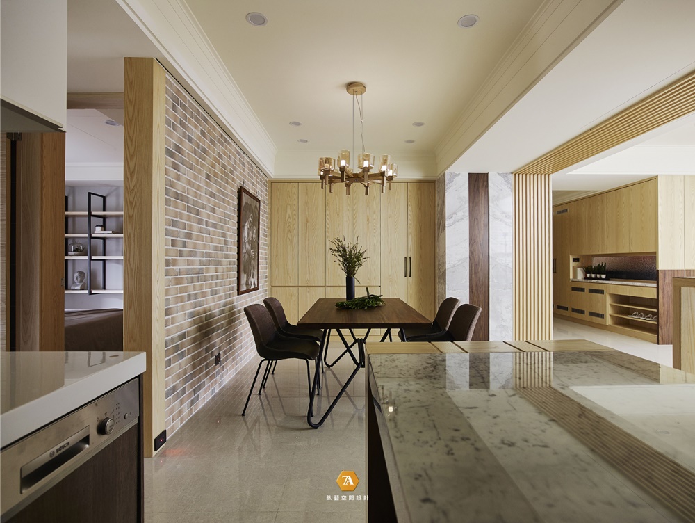 緊接著來到餐廳,溫潤木質格柵將客廳與餐廳無形中區隔開來,為空間增添意趣;開放式的廚房與木製吧臺,搭配鐵件餐桌,則為空間註入年輕活力,與餐廳及客廳背景墻形成強烈對比,帶來不一樣的視覺感受。
