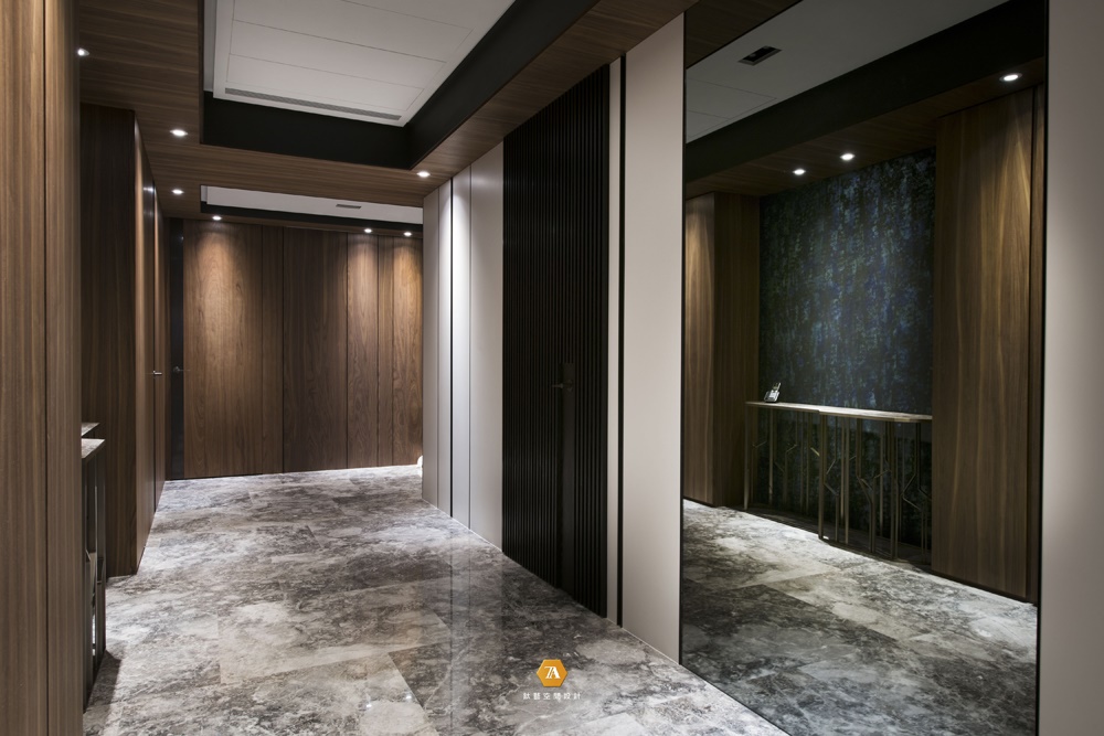 廊道串接所有私領域,透過墻面分割,材質交錯的手法,讓臥室門體虛化。