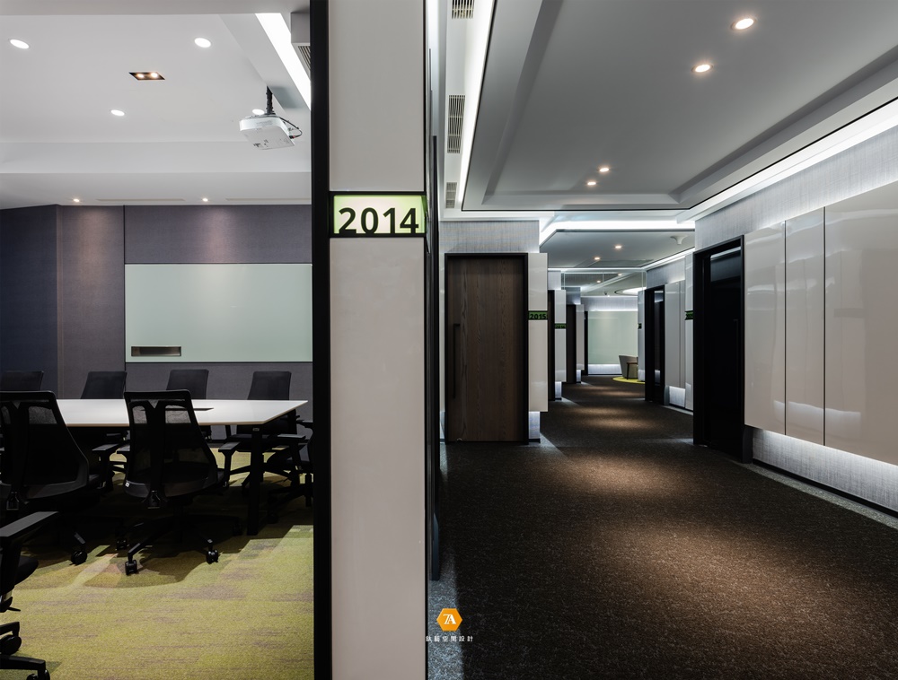 隨著探索的步伐邁進,明朗而開闊的通道將人引領至多功能區域,打破放松氛圍與辦事效率無法兼容的刻板印象;並以招牌的「綠點」作為場域劃分的弱分界,將實木桌幾與棉布沙發溫馨地圍聚一處,其自然舒展的漸層紋理,使環境的舒心氣氛更加飽滿。而設計師另規劃了獨立的多功能間,於穩重的木石基調中,草綠及天藍色轉而作為點綴,圍塑出舒服而隱密的空間;既能作為小型派對地點,也能是外賓演講的所在,使場域於松緩愉悅的主調中完備多種機能。