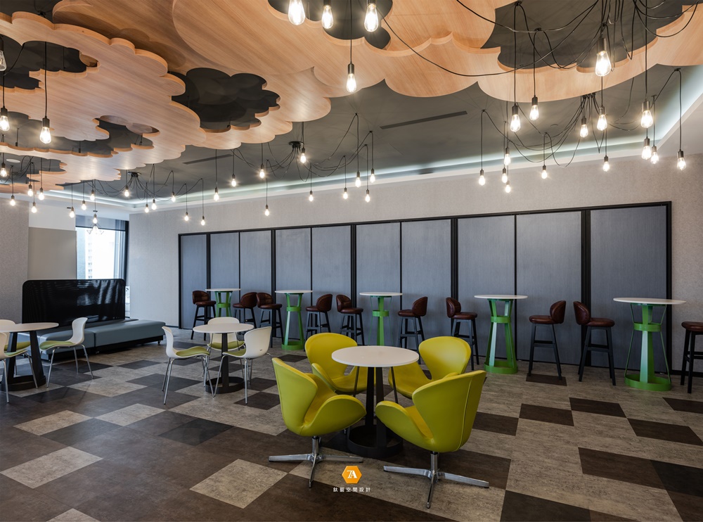 員工辦公時的心理狀態要照顧,用餐時刻當然也不能忘。員工餐區轉化直述「綠」的設計手法,以一顆全木質的「主樹」為中心,向上鋪展出雲朵般的高低層序,從樹根的角度看去,亦象是籠罩於枝節繁茂的樹翼之下;巧心的鏤空造型使裸露天幕隨處隱現,讓視野隨之開放;而盞盞看似隨性垂吊的復古燈具,加之四面開窗所透入的溫暖采光,將明媚灑落人們的胸廓,進而使夾於事務間的中場休息,獲得徹底緩解。