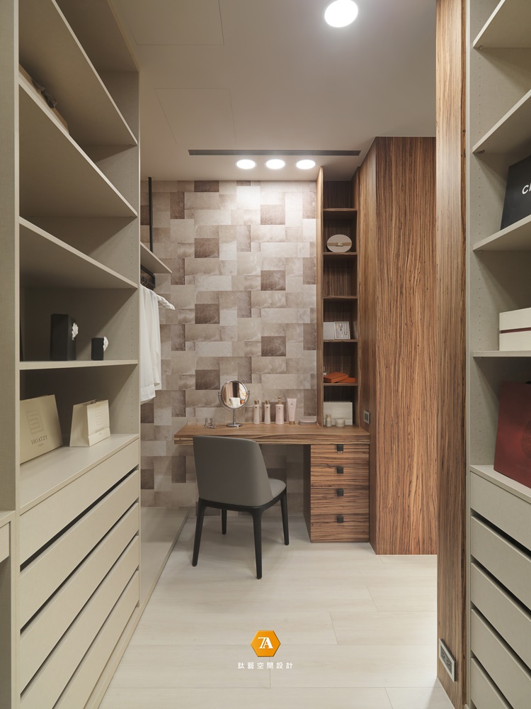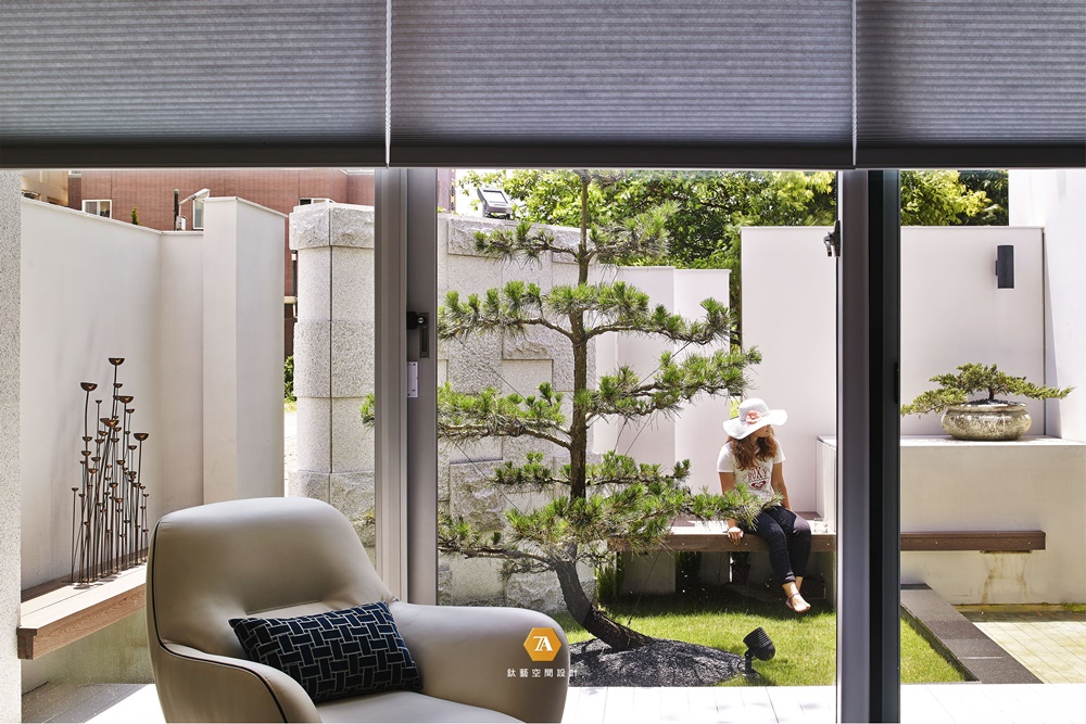 玄關處設置,拉開為門,闔起為畫。以室內空間為載體,將水墨藝術融入其中,創造具有審美意趣的居家空間。留白,在中國的水墨畫中極其重要且具美感。透過家具的配色及植栽盆的掛置,讓綠意自然地融入生活,和窗外的庭院意象相互呼應,即便身處家中也能享有一片綠地。並運用穿透的玻璃窗,使客廳的空間隨天色而有不同的景緻變化,更直接地感受自然的氛圍。