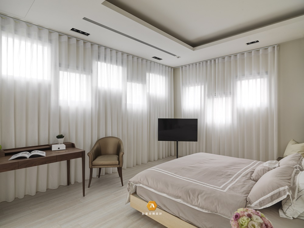 在二樓的臥室裡,兩邊大幅面積對立的落地窗,視域更加寬闊。窗戶捲簾特殊設計,讓每一道窗成為一幅畫;白天是透視的窗,夜晚是美麗的畫,整體空間多了幾分意趣!