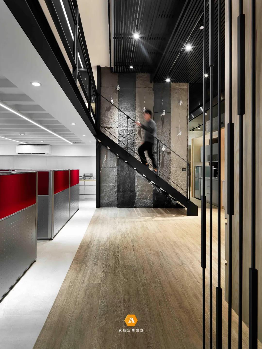 由玄關深入至整個空間主體之中,玄關木紋磚也隨之至此,在與辦公區的相交的地方,劃定出了一條完美的界線,辦公空間的氛圍也就與玄關氛圍有所不同。設計師將過高的樓層進行了劃分,下層為員工辦公區,上層則為主管及會議室;員工辦公區無論是墻地面、亦或是天花,都以白色構造,搭配自然光線與明亮燈光,營造出了寬敞明亮的空間氛圍,弱化層高壓低後的壓抑感。
