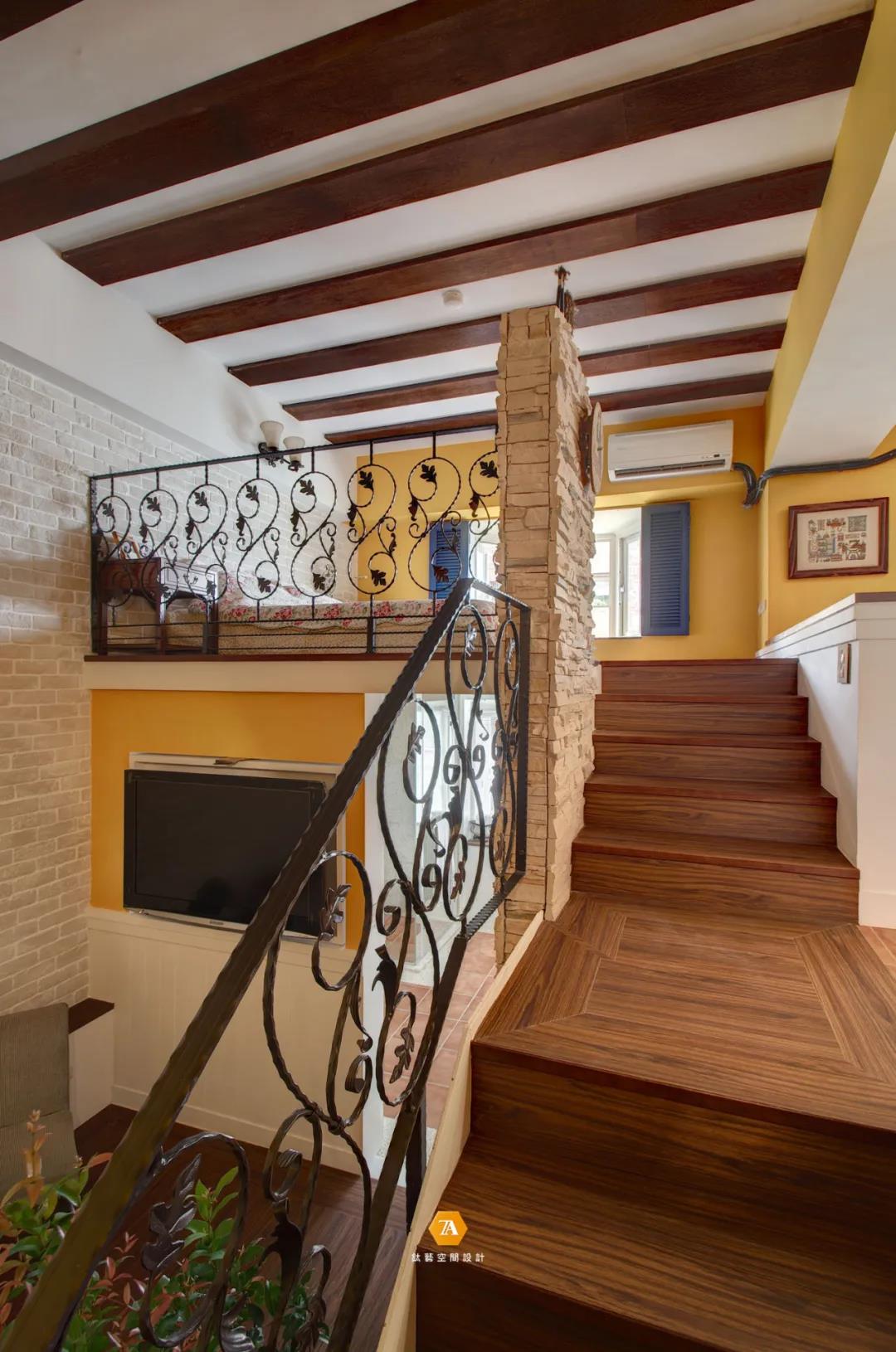 而土黃色墻面也隨之從玄關向內蔓延至整個空間,奠定了整個空間濃濃的「鄉村」氛圍基調,寧靜舒適。餐桌以卡座的形式表現,盡可能的使空間放大,而在電視墻的設計上,設計師用百葉窗的造型來巧妙隱藏電視,使空間保持一種整潔幹凈,淳樸原始的感受。天花以體積龐大、質地厚重的粗獷木材,均勻的排列於整個空間之中,讓本是淳樸的空間稍顯氣派,帶來不同的空間感受。