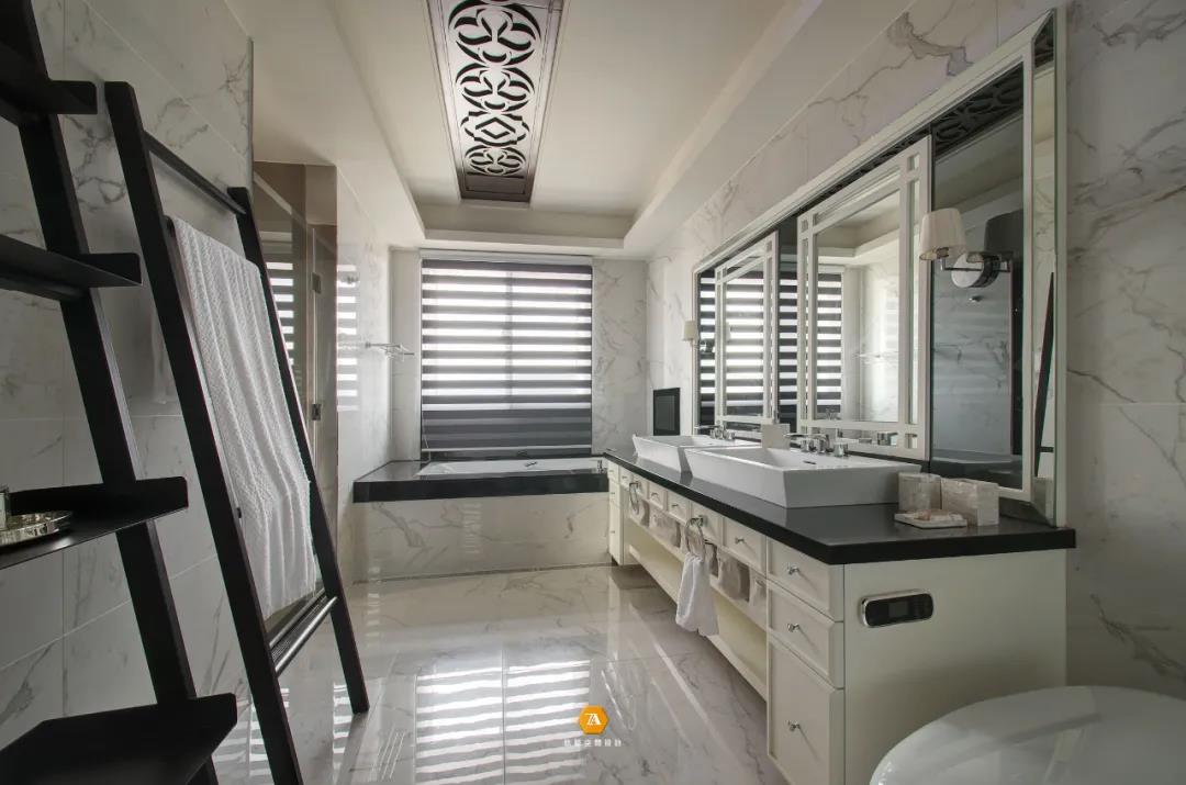 在主臥與次臥的設計上,設計師以兩種不同的氛圍來營造空間。主臥延用客餐廳的藝術天花,同時結合富有層次的床頭背景墻,營造出一種踏實安穩的氛圍基調,使人置身空間之中,便能遺忘生活所帶來的煩擾,安心入睡。而次臥與主臥的感受卻截然不同,寬敞明亮、簡約舒心是對這一空間的最佳形容,沒有過多的造型修飾,簡簡單單,搭配深色木地板與大面積落地窗,無論是白天或是晚上,在這一空間,都是極致的享受。