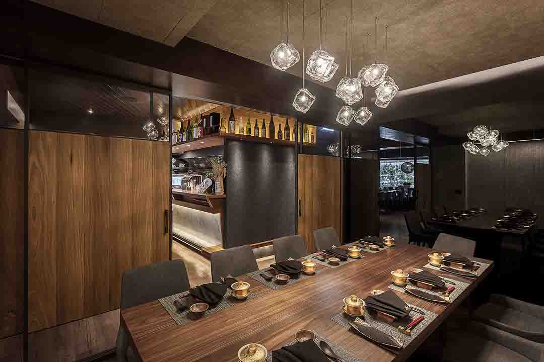 竹,自古以來無論是在日本,還是在中國,均以各種各樣的形式而為人們所用。設計師回歸自然本質的理念,在入口的兩旁,栽種了滿排的竹,在喧囂的都市中,忽見一角竹影,嘈雜被退卻了,換而一種安靜。延著入口進去,深色木格柵天花與立面弧形相接,延伸了相對較小的空間,並使得更有層次感。石組墻面、襯著山水的玄妙凸顯整體空間雖然小但不失精致。