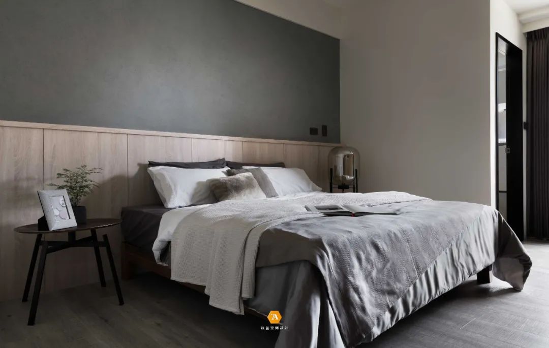優美典雅的主臥空間,床頭立面使用花卉圖騰的繃皮,佐上兩側的文化石,油然呈現空間的混搭美學。開放寬敞的主臥空間,具備睡眠,展示櫃、更衣室、工作及衛浴等功能,讓屋主夫妻的生活更加便利。
