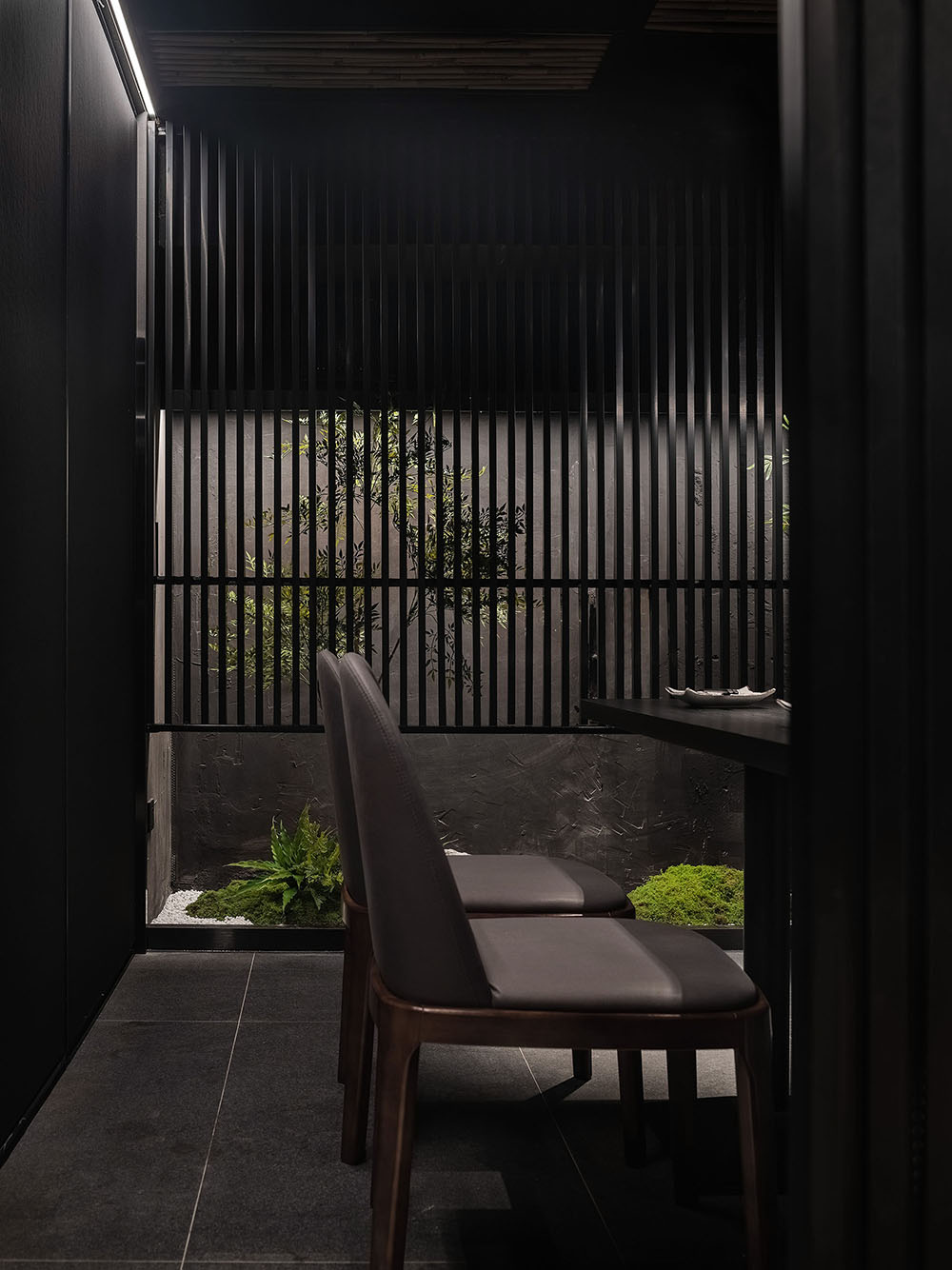 黑色,獨立專註,是生命中的純粹之色,經久不衰而歷久彌新,低調卻又盡顯鋒芒。猶如潤物細無聲的日料手法,執著專註,極凈內斂,嚴謹而細致。設計將食材、烹飪、氣氛蘊藏在濃郁的清酒文化韻味中,在柔和而有層次的輔助光源下,讓食客享受美味的光與色。