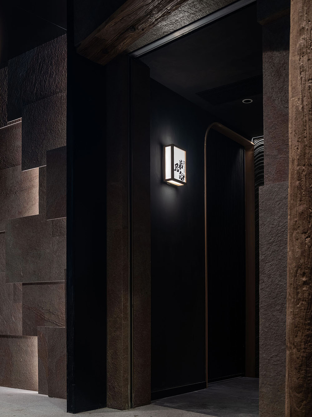 入口隐秘而低调,无招牌设计别具一格。设计拒绝平凡的立面表达,相互交叠的岩板错位分布,雕塑感的光影犹如鲤鱼鳞片栩栩如生,塑造印象深刻的感官体验。择老榆木树干作门头立柱,古朴的瓦片元素运用现代手法重复叠加,日式传统精粹融合现代设计精神,守拙出新。两株玉兰慵懒的攀缘在肌理感丰富的墙面上,东方美呼之欲出。微弱的间接光源融入氤氲的夜色中,引领食客暂别喧嚣,放松身心,体会慢生活格调。入口隱秘而低調,無招牌設計別具一格。設計拒絕平凡的立面表達,相互交疊的巖板錯位分布,雕塑感的光影猶如鯉魚鱗片栩栩如生,塑造印象深刻的感官體驗。擇老榆木樹幹作門頭立柱,古樸的瓦片元素運用現代手法重復疊加,日式傳統精粹融合現代設計精神,守拙出新。兩株玉蘭慵懶的攀緣在肌理感豐富的墻面上,東方美呼之欲出。